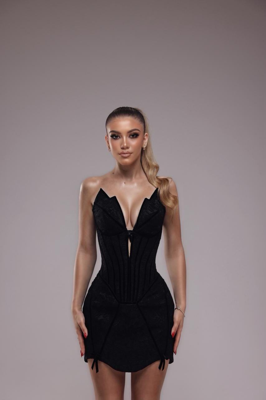 A sculpted lace corset dress designed to define and enhance the silhouette.