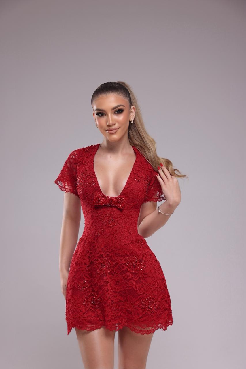 Elegant short red lace dress with hand-embroidered beads and crystals, front and back glamour. sophisticated, timeless